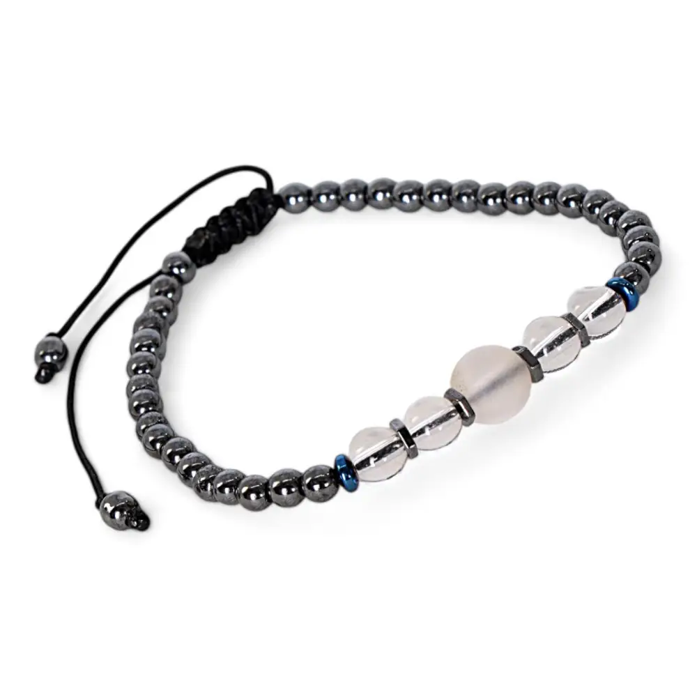 Das Armband aus grauen Perlen und Mondstein sieht aus wie ein Mond. Das Metall und die Kristalle reflektieren das Licht. Dieses Armband ist ein Muss für alle, die minimalistische Raffinesse lieben.